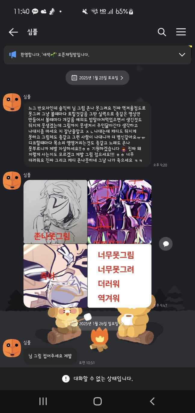 무엇보다 쿠마레님은 비계에서 트친의 그림을 비난, 죽으라는등의 이야기를 하였으며 그 사람의 오픈채팅방에 익명으로 들어가 장문의 욕을 남기는등의 행동을 보이셨습니다.